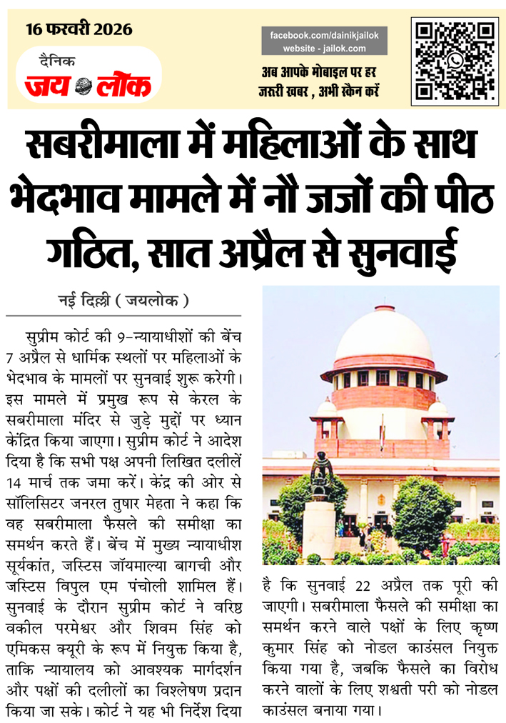 सबरीमाला में महिलाओं के साथ भेदभाव मामले में नौ जजों की पीठ गठित, सात अप्रैल से सुनवाई