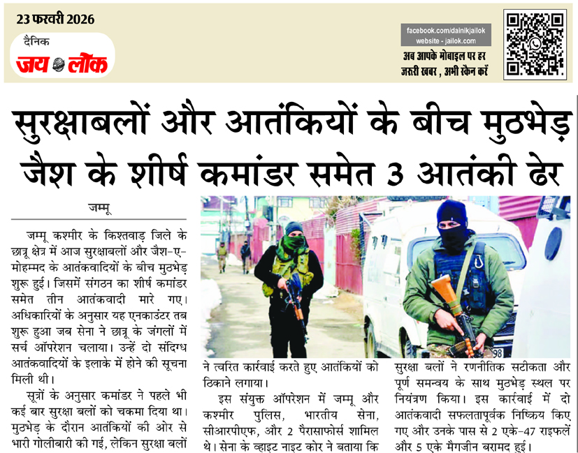सुरक्षाबलों और आतंकियों के बीच मुठभेड़ जैश के शीर्ष कमांडर समेत 3 आतंकी ढेर