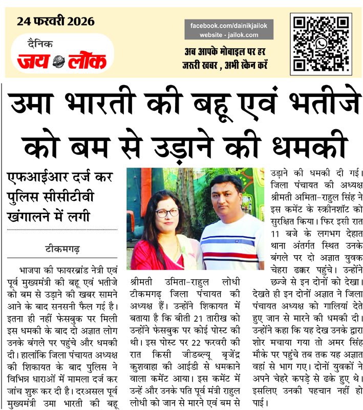 उमा भारती की बहू एवं भतीजे को बम से उड़ाने की धमकी