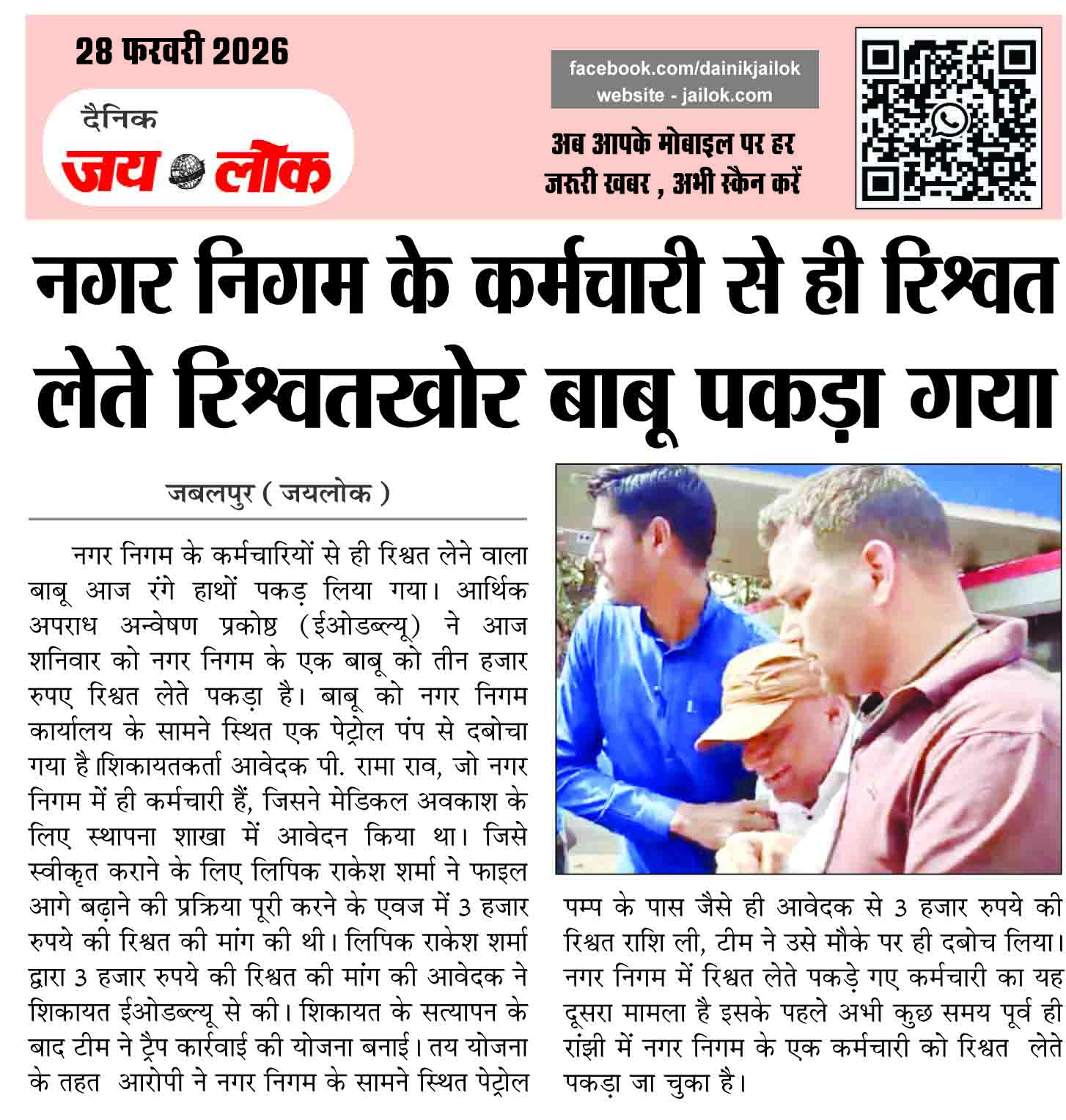 नगर निगम के कर्मचारी से ही रिश्वत लेते रिश्वतखोर बाबू पकड़ा गया