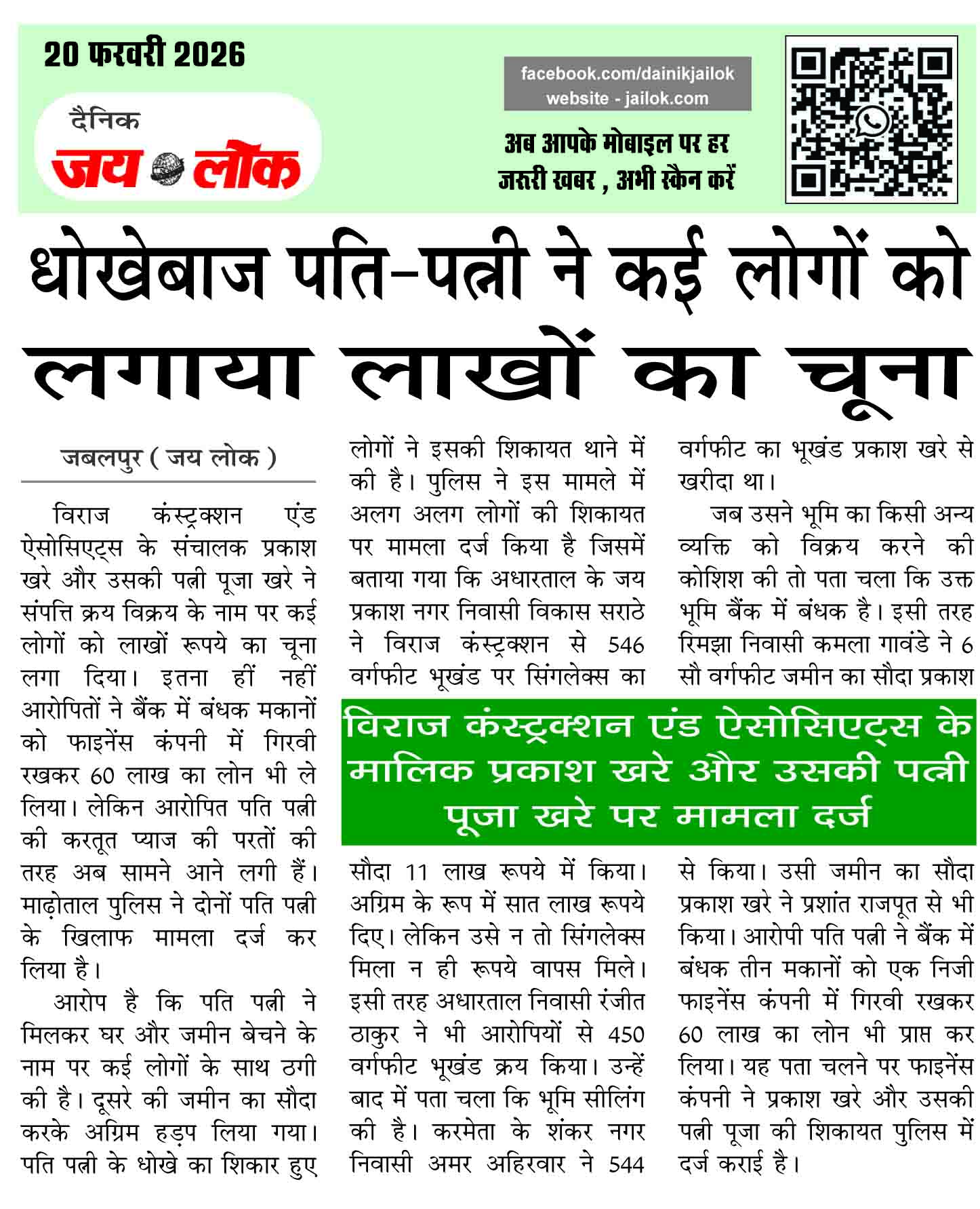 धोखेबाज पति-पत्नी ने कई लोगों को लगाया लाखों का चूना, विराज कंस्ट्रक्शन एंड ऐसोसिएट्स के मालिक प्रकाश खरे और उसकी पत्नी पूजा खरे पर मामला दर्ज