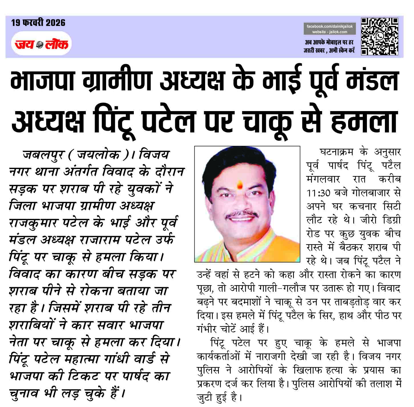 भाजपा ग्रामीण अध्यक्ष के भाई पूर्व मंडल अध्यक्ष पिंटू पटेल पर चाकू से हमला