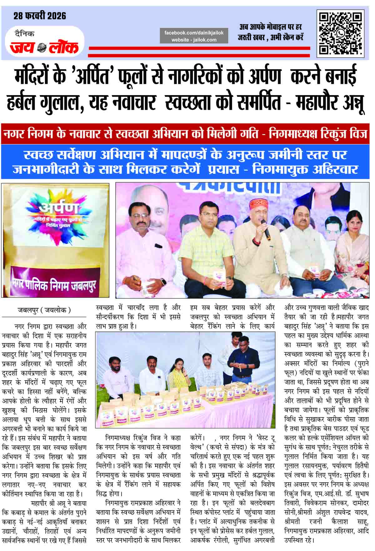 मंदिरों के ’अर्पित’ फूलों से नागरिकों को ‘अर्पण ‘ करने बनाई हर्बल गुलाल, यह नवाचार स्वच्छ्ता को समर्पित – महापौर अन्नू