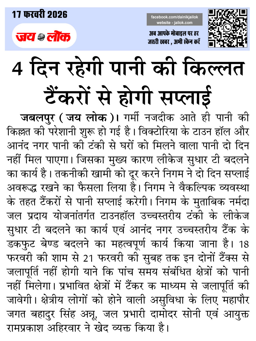 4 दिन रहेगी पानी की किल्लत टैंकरों से होगी सप्लाई