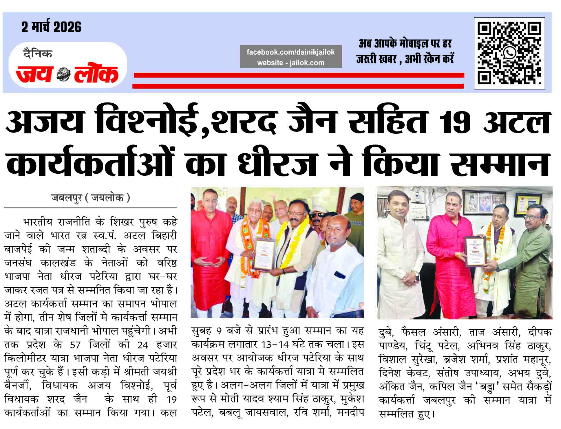 अजय विश्नोई,शरद जैन सहित 19 अटल कार्यकर्ताओं का धीरज ने किया सम्मान