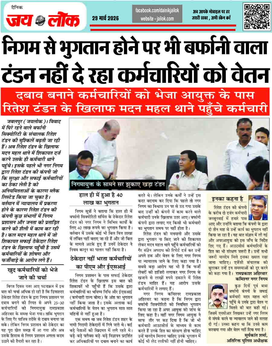 निगम से भुगतान होने पर भी बर्फानी वाला टंडन नहीं दे रहा कर्मचारियों को वेतन, दबाव बनाने कर्मचारियों को भेजा आयुक्त के पास रितेश टंडन के खिलाफ मदन महल थाने पहुँचे कर्मचारी