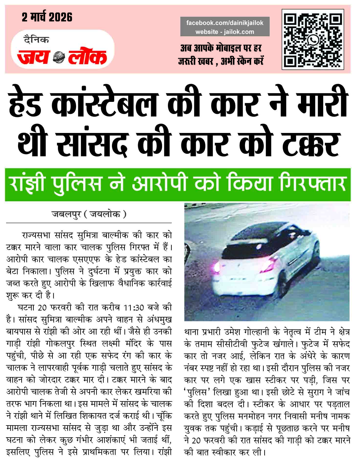 हेड कांस्टेबल की कार ने मारी थी सांसद की कार को टक्कर, रांझी पुलिस ने आरोपी को किया गिरफ्तार