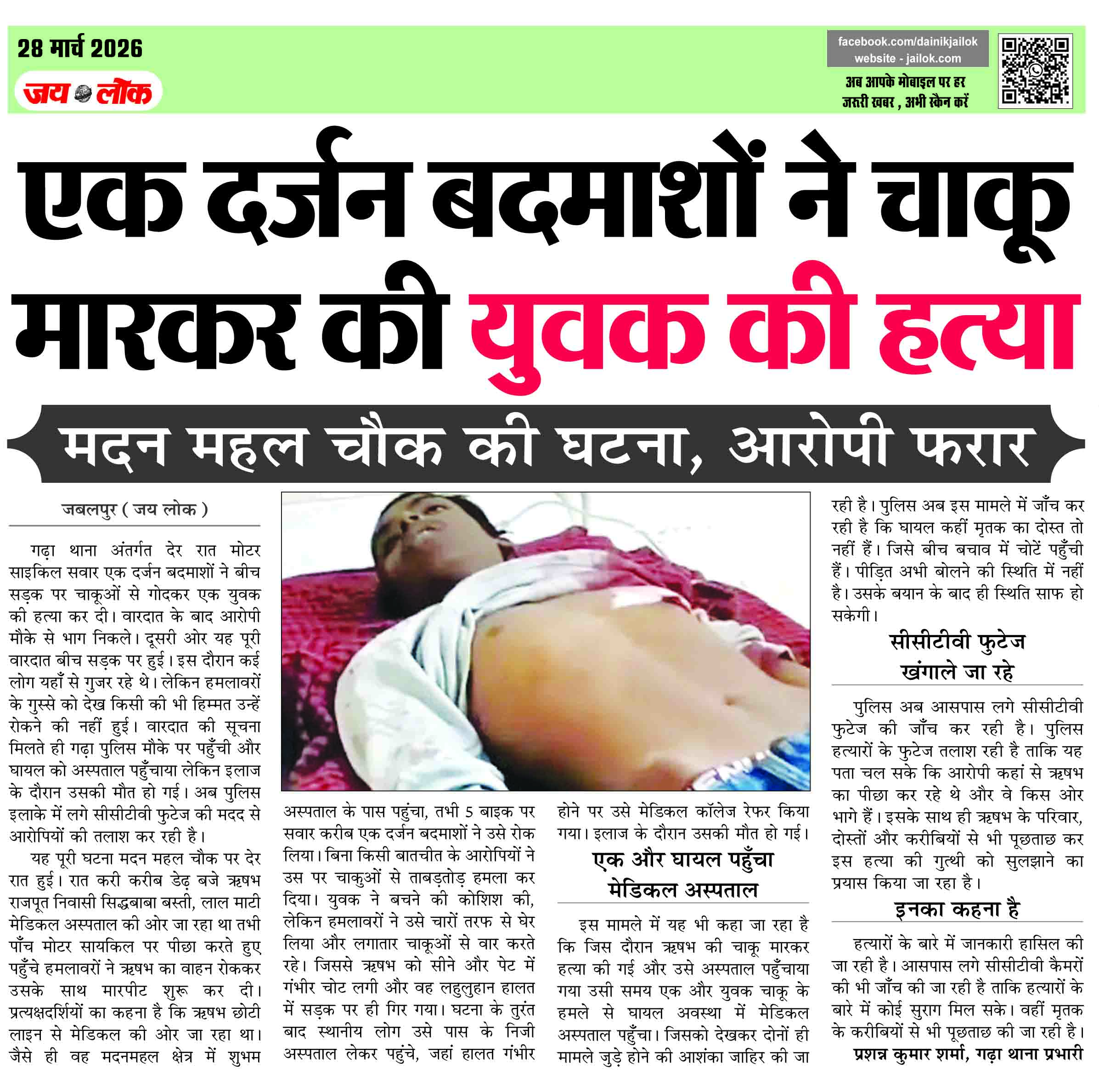 एक दर्जन बदमाशों ने चाकू मारकर की युवक की हत्या, मदन महल चौक की घटना, आरोपी फरार