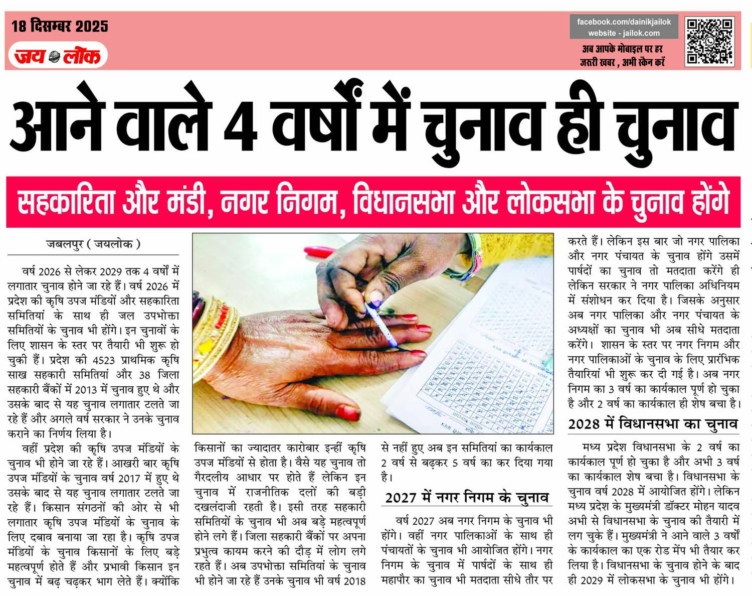 जबलपुर (जयलोक)। वर्ष 2026 से लेकर 2029 तक 4 वर्षों में लगातार चुनाव होने जा रहे हैं। वर्ष 2026 में प्रदेश की कृषि उपज मंडियों और सहकारिता समितियां के साथ ही जल उपभोक्ता समितियों के चुनाव भी होंगे। इन चुनावों के लिए शासन के स्तर पर तैयारी भी शुरू हो चुकी हैं। प्रदेश की 4523 प्राथमिक कृषि साख सहकारी समितियां और 38 जिला सहकारी बैंकों में 2013 में चुनाव हुए थे और उसके बाद से यह चुनाव लगातार टलते जा रहे हैं और अगले वर्ष सरकार ने उनके चुनाव कराने का निर्णय लिया है।