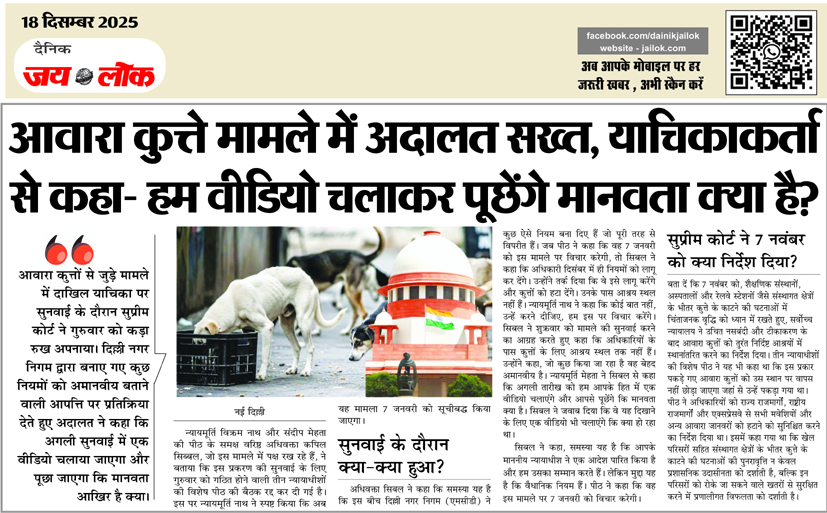 बता दें कि 7 नवंबर को, शैक्षणिक संस्थानों, अस्पतालों और रेलवे स्टेशनों जैसे संस्थागत क्षेत्रों के भीतर कुत्ते के काटने की घटनाओं में चिंताजनक वृद्धि को ध्यान में रखते हुए, सर्वोच्च न्यायालय ने उचित नसबंदी और टीकाकरण के बाद आवारा कुत्तों को तुरंत निर्दिष्ट आश्रयों में स्थानांतरित करने का निर्देश दिया। तीन न्यायाधीशों की विशेष पीठ ने यह भी कहा था कि इस प्रकार पकड़े गए आवारा कुत्तों को उस स्थान पर वापस नहीं छोड़ा जाएगा जहां से उन्हें पकड़ा गया था। पीठ ने अधिकारियों को राज्य राजमार्गों, राष्ट्रीय राजमार्गों और एक्सप्रेसवे से सभी मवेशियों और अन्य आवारा जानवरों को हटाने को सुनिश्चित करने का निर्देश दिया था। इसमें कहा गया था कि खेल परिसरों सहित संस्थागत क्षेत्रों के भीतर कुत्ते के काटने की घटनाओं की पुनरावृत्ति न केवल प्रशासनिक उदासीनता को दर्शाती है, बल्कि इन परिसरों को रोके जा सकने वाले खतरों से सुरक्षित करने में प्रणालीगत विफलता को दर्शाती है।