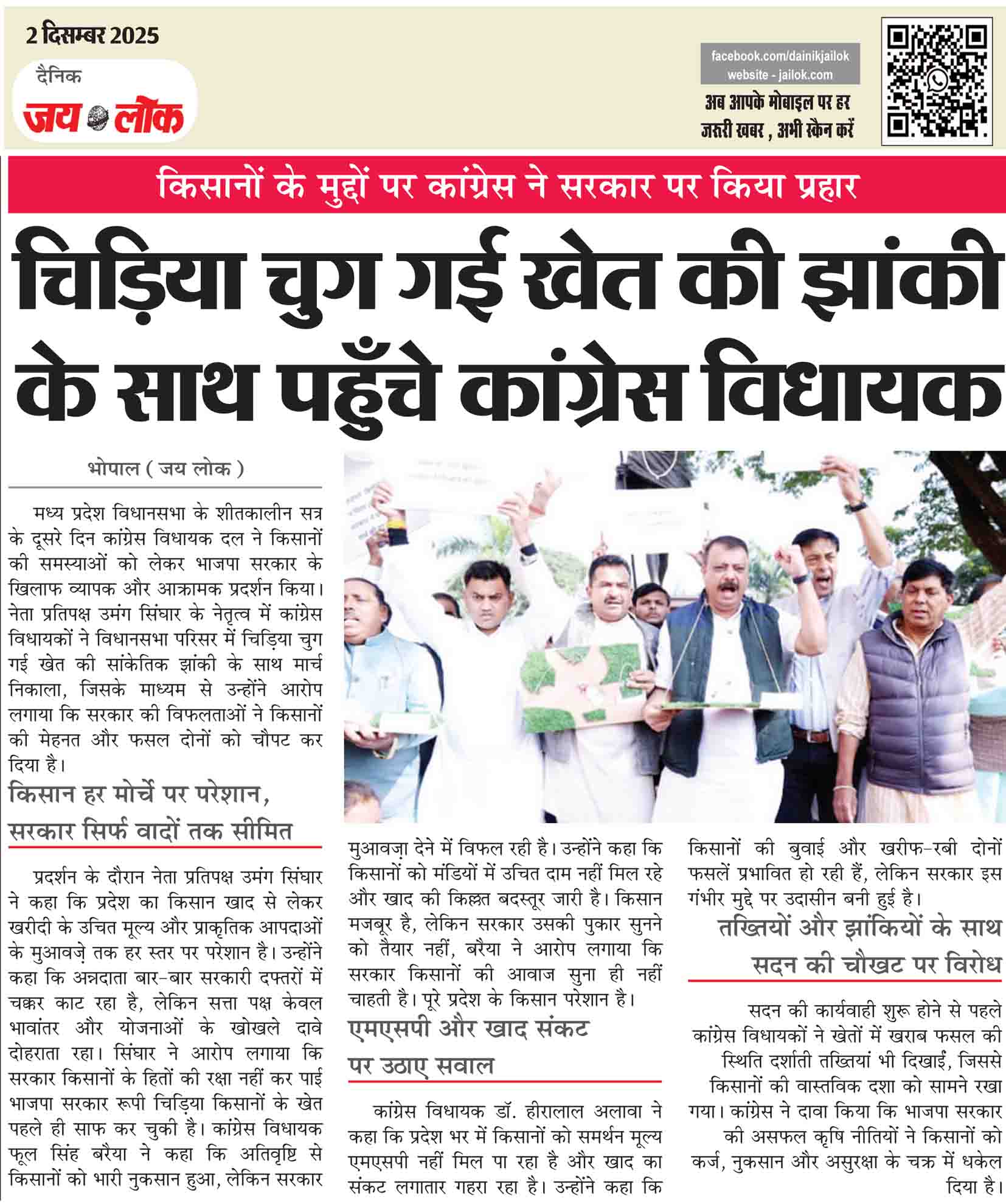 भोपाल (जय लोक)। मध्य प्रदेश विधानसभा के शीतकालीन सत्र के दूसरे दिन कांग्रेस विधायक दल ने किसानों की समस्याओं को लेकर भाजपा सरकार के खिलाफ व्यापक और आक्रामक प्रदर्शन किया। नेता प्रतिपक्ष उमंग सिंघार के नेतृत्व में कांग्रेस विधायकों ने विधानसभा परिसर में चिडिय़ा चुग गई खेत की सांकेतिक झांकी के साथ मार्च निकाला, जिसके माध्यम से उन्होंने आरोप लगाया कि सरकार की विफलताओं ने किसानों की मेहनत और फसल दोनों को चौपट कर दिया है।