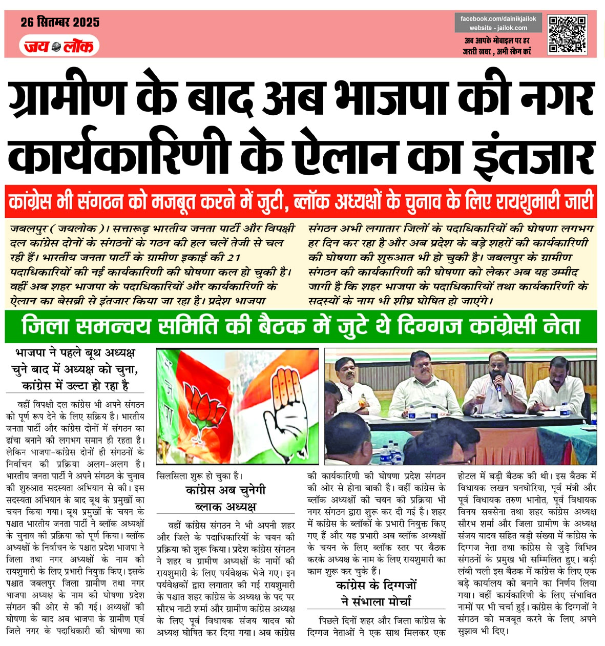 जबलपुर (जयलोक)। सत्तारूढ़ भारतीय जनता पार्टी और विपक्षी दल कांग्रेस दोनों के संगठनों के गठन की हल चलें तेजी से चल रही हैं। भारतीय जनता पार्टी के ग्रामीण इकाई की 21 पदाधिकारियों की नई कार्यकारिणी की घोषणा कल हो चुकी है। वहीं अब शहर भाजपा के पदाधिकारियों और कार्यकारिणी के ऐलान का बेसब्री से इंतजार किया जा रहा है। प्रदेश भाजपा संगठन अभी लगातार जिलों के पदाधिकारियों की घोषणा लगभग हर दिन कर रहा है और अब प्रदेश के बड़े शहरों की कार्यकारिणी की घोषणा की शुरुआत भी हो चुकी है। जबलपुर के ग्रामीण संगठन की कार्यकारिणी की घोषणा को लेकर अब यह उम्मीद जागी है कि शहर भाजपा के पदाधिकारियों तथा कार्यकारिणी के सदस्यों के नाम भी शीघ्र घोषित हो जाएंगे।