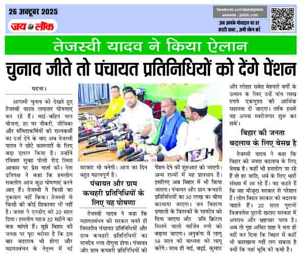 पटना। आगामी चुनाव को देखते हुए तेजस्वी यादव लगातार घोषणाएं कर रहे हैं। माई-बहिन मान योजना, हर घर नौकरी, जीविका और संविदाकर्मियों को राज्यकर्मी का दर्जा देने के बाद अब तेजस्वी यादव ने छोटे कामगारों के लिए बड़ा एलान किया है। उन्होंने रविवार सुबह पोलो रोड स्थित आवास पर प्रेस वार्ता की। नेता प्रतिपक्ष ने कहा कि हमलोग सबलोग आज कुछ घोषणाएं करने आए हैं। तेजस्वी ने किसी का नुकसान नहीं किया। तेजस्वी से किसी को कोई शिकायत भी नहीं है। जनता ने एनडीए को 20 साल दिया। हमलोग महज 20 महीने का वक्त मांगते हैं। मुझे बिहार की जनता पर पूरा भरोसा है कि इस बार बदलाव भी होगा और महगठबंधन के नेतृत्व में नई सरकार भी बनेगी। आज का दिन बहुत महत्वपूर्ण है।