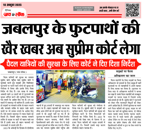जबलपुर (जय लोक)। पैदल यात्रियों की सुरक्षा का मामला सुप्रीम कोर्ट पहुँचा यहां सुप्रीम कोर्ट ने सुनवाई करते हुए सडक़ों और विशेषकर फुटपाथों पर चलने वाले लोगों की सुरक्षा को गंभीरता से लिया और इसके लिए दिशा निर्देश भी दिए हैं। दस लाख से ज्यादा आबादी वाले 50 शहरों को में फुटपाथों का सुरक्षा ऑडिट करने और सुरक्षित पैदल पार पथ बनाने के आदेश दिए गए हैं। इन 50 शहरों में जबलपुर भी शामिल हैं। इसके साथ ही सडक़ों पर मनमाने तरीके से वाहन चलाने और मनमाने तरीके से वाहन पार्क करने वालों पर भी लगाम लगाने के आदेश दिए हैं। ऐसे मामले जबलपुर में ज्यादा देखने को मिलते हैं। जिसमें वाहन चालक मनमाने तरीके से सडक़ पर कहीं भी वाहन पार्क कर देते हैं इसके साथ ही वाहन चालकों की लापरवाही से हादसे होते हैं।