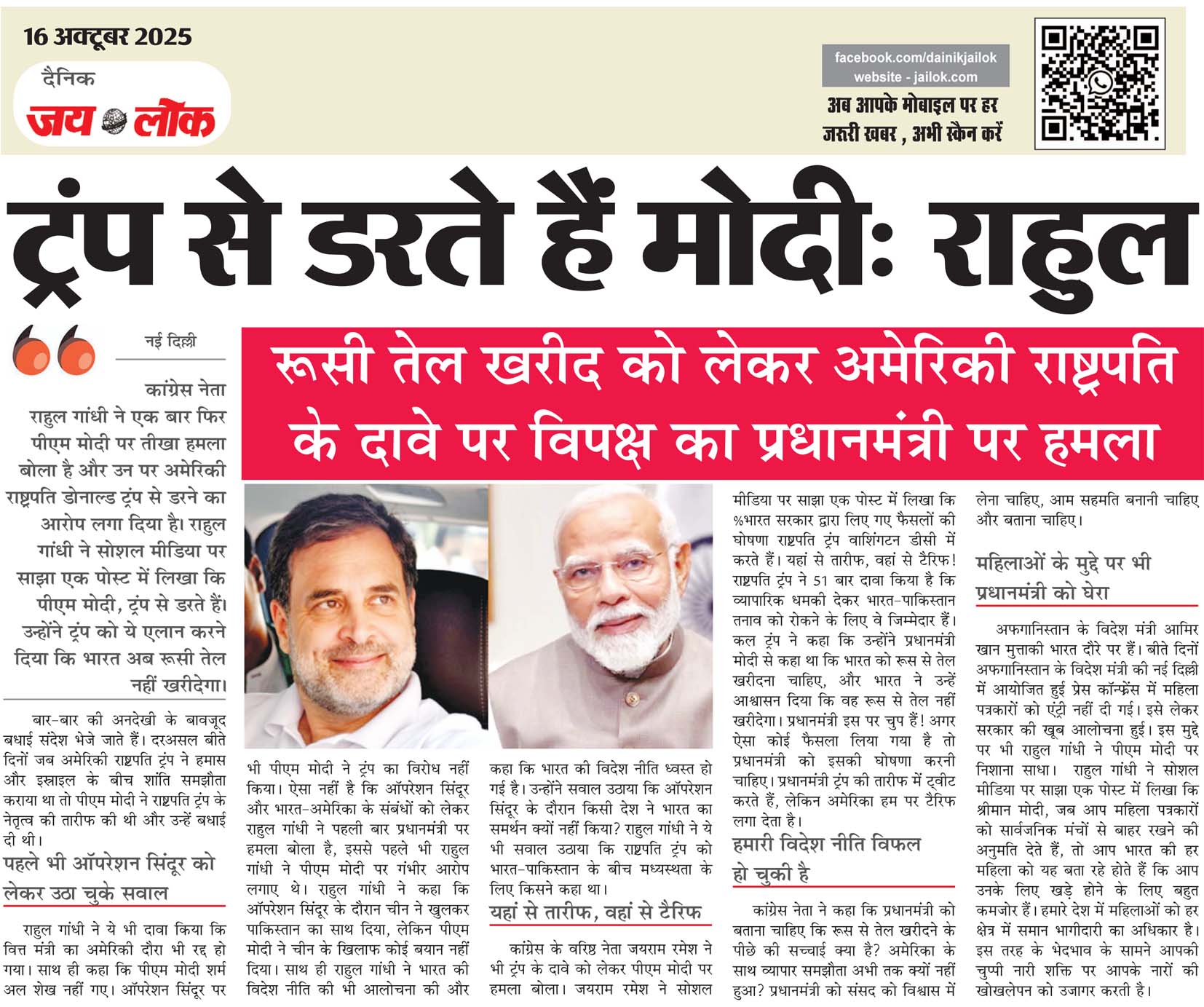 कांग्रेस के वरिष्ठ नेता जयराम रमेश ने भी ट्रंप के दावे को लेकर पीएम मोदी पर हमला बोला। जयराम रमेश ने सोशल मीडिया पर साझा एक पोस्ट में लिखा कि ‘भारत सरकार द्वारा लिए गए फैसलों की घोषणा राष्ट्रपति ट्रंप वाशिंगटन डीसी में करते हैं। यहां से तारीफ, वहां से टैरिफ! राष्ट्रपति ट्रंप ने 51 बार दावा किया है कि व्यापारिक धमकी देकर भारत-पाकिस्तान तनाव को रोकने के लिए वे जिम्मेदार हैं। कल ट्रंप ने कहा कि उन्होंने प्रधानमंत्री मोदी से कहा था कि भारत को रूस से तेल खरीदना चाहिए, और भारत ने उन्हें आश्वासन दिया कि वह रूस से तेल नहीं खरीदेगा। प्रधानमंत्री इस पर चुप हैं! अगर ऐसा कोई फैसला लिया गया है तो प्रधानमंत्री को इसकी घोषणा करनी चाहिए। प्रधानमंत्री ट्रंप की तारीफ में ट्वीट करते हैं, लेकिन अमेरिका हम पर टैरिफ लगा देता है।