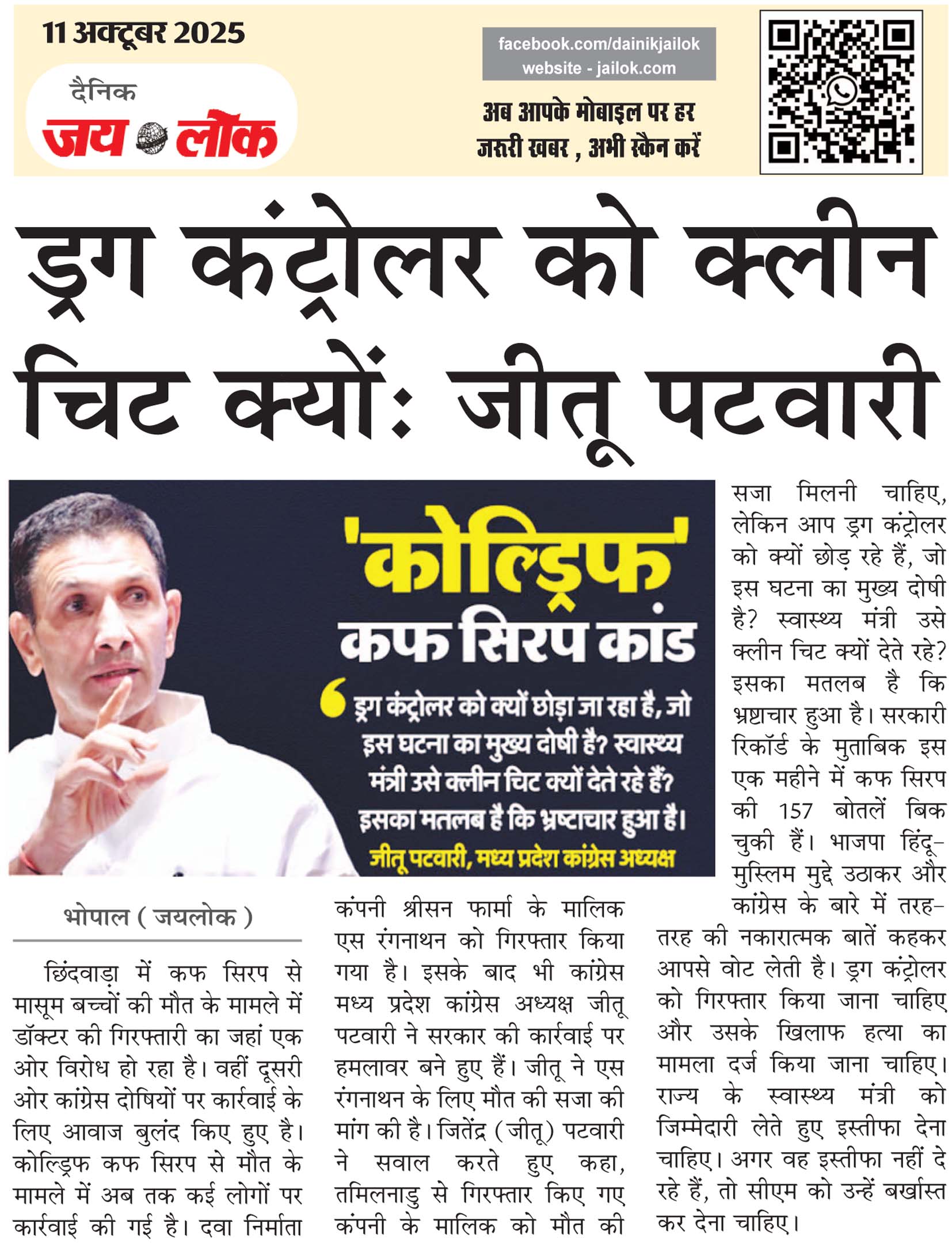 भोपाल (जयलोक)। छिंदवाड़ा में कफ सिरप से मासूम बच्चों की मौत के मामले में डॉक्टर की गिरफ्तारी का जहां एक ओर विरोध हो रहा है। वहीं दूसरी ओर कांग्रेस दोषियों पर कार्रवाई के लिए आवाज बुलंद किए हुए है। कोल्ड्रिफ कफ सिरप से मौत के मामले में अब तक कई लोगों पर कार्रवाई की गई है। दवा निर्माता कंपनी श्रीसन फार्मा के मालिक एस रंगनाथन को गिरफ्तार किया गया है। इसके बाद भी कांग्रेस मध्य प्रदेश कांग्रेस अध्यक्ष जीतू पटवारी ने सरकार की कार्रवाई पर हमलावर बने हुए हैं। जीतू ने एस रंगनाथन के लिए मौत की सजा की मांग की है। जितेंद्र (जीतू) पटवारी ने सवाल करते हुए कहा, तमिलनाडु से गिरफ्तार किए गए कंपनी के मालिक को मौत की सजा मिलनी चाहिए, लेकिन आप ड्रग कंट्रोलर को क्यों छोड़ रहे हैं, जो इस घटना का मुख्य दोषी है? स्वास्थ्य मंत्री उसे क्लीन चिट क्यों देते रहे? इसका मतलब है कि भ्रष्टाचार हुआ है। सरकारी रिकॉर्ड के मुताबिक इस एक महीने में कफ सिरप की 157 बोतलें बिक चुकी हैं। भाजपा हिंदू-मुस्लिम मुद्दे उठाकर और कांग्रेस के बारे में तरह-तरह की नकारात्मक बातें कहकर आपसे वोट लेती है। ड्रग कंट्रोलर को गिरफ्तार किया जाना चाहिए और उसके खिलाफ हत्या का मामला दर्ज किया जाना चाहिए। राज्य के स्वास्थ्य मंत्री को जिम्मेदारी लेते हुए इस्तीफा देना चाहिए। अगर वह इस्तीफा नहीं दे रहे हैं, तो सीएम को उन्हें बर्खास्त कर देना चाहिए।