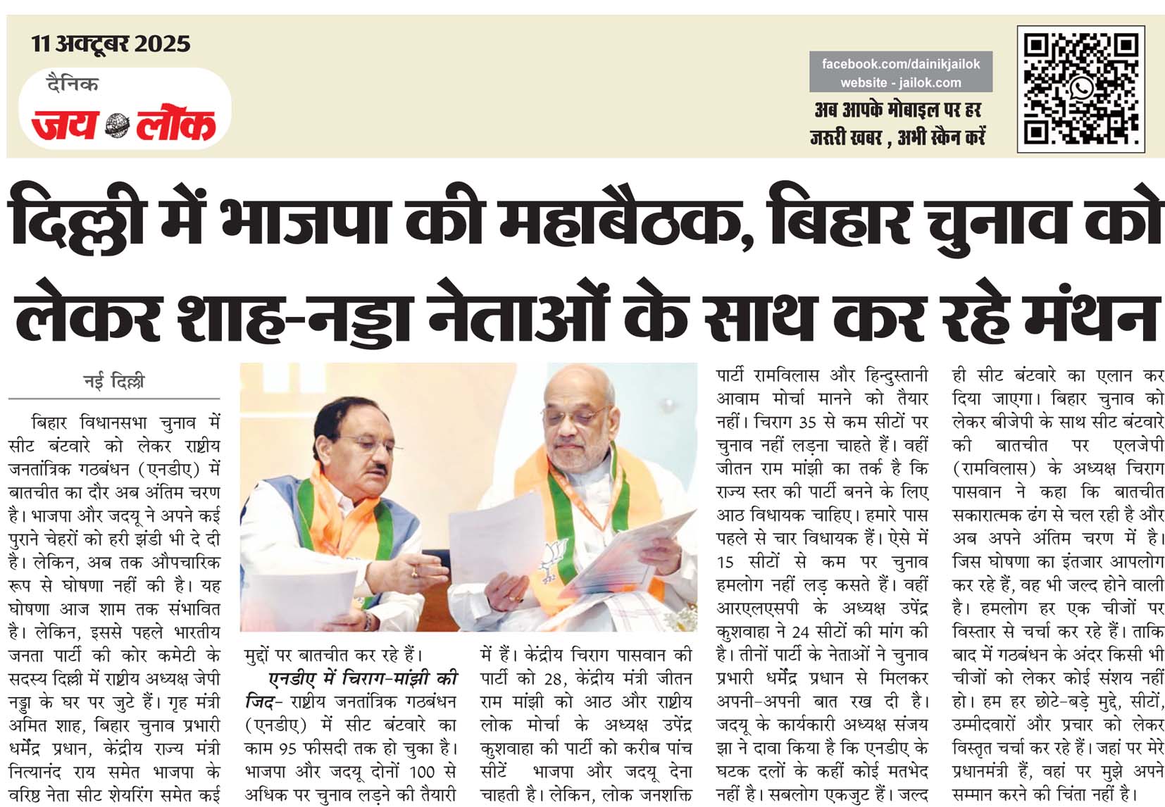 नई दिल्ली। बिहार विधानसभा चुनाव में सीट बंटवारे को लेकर राष्ट्रीय जनतांत्रिक गठबंधन (एनडीए) में बातचीत का दौर अब अंतिम चरण है। भाजपा और जदयू ने अपने कई पुराने चेहरों को हरी झंडी भी दे दी है। लेकिन, अब तक औपचारिक रूप से घोषणा नहीं की है। यह घोषणा आज शाम तक संभावित है। लेकिन, इससे पहले भारतीय जनता पार्टी की कोर कमेटी के सदस्य दिल्ली में राष्ट्रीय अध्यक्ष जेपी नड्डा के घर पर जुटे हैं। गृह मंत्री अमित शाह, बिहार चुनाव प्रभारी धर्मेंद्र प्रधान, केंद्रीय राज्य मंत्री नित्यानंद राय समेत भाजपा के वरिष्ठ नेता सीट शेयरिंग समेत कई मुद्दों पर बातचीत कर रहे हैं।