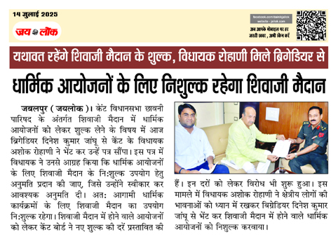 जबलपुर (जयलोक)। केंट विधानसभा छावनी पारिषद के अंतर्गत शिवाजी मैदान में धार्मिक आयोजनों को लेकर शुल्क लेने के विषय में आज ब्रिगेडियर दिनेश कुमार जांघू से केंट के विधायक अशोक रोहाणी ने भेंट कर उन्हें पत्र सौंपा। इस पत्र में विधायक ने उनसे आग्रह किया कि धार्मिक आयोजनों के लिए शिवाजी मैदान के नि:शुल्क उपयोग हेतु अनुमति प्रदान की जाए, जिसे उन्होंने स्वीकार कर आवश्यक अनुमति दी। अत: आगामी धार्मिक कार्यक्रमों के लिए शिवाजी मैदान का उपयोग नि:शुल्क रहेगा। शिवाजी मैदान में होने वाले आयोजनों को लेकर केंट बोर्ड ने नए शुल्क की दरें प्रस्तावित की हैं। इन दरों को लेकर विरोध भी शुरू हुआ। इस मामले में विधायक अशोक रोहाणी ने क्षेत्रीय लोगों की भावनाओं को ध्यान में रखकर बिग्रेडियर दिनेश कुमार जांघू से भेंट कर शिवाजी मैदान में होने वाले धार्मिक आयोजनों को निशुल्क करवाया।
