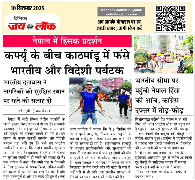 नई दिल्ली (जयलोक)। नेपाल में जारी हिंसक विरोध प्रदर्शनों के चलते हालात बेहद तनावपूर्ण हो गए हैं। राजधानी काठमांडू सहित कई इलाकों में पथराव, आगजनी और झड़पों की घटनाएं सामने आ रही हैं। इन हालात के कारण सैकड़ों भारतीय और विदेशी पर्यटक वहां फंसे हुए हैं। फंसे हुए भारतीय नागरिकों ने बताया कि उन्होंने भारतीय दूतावास से संपर्क किया है। दूतावास ने उन्हें अपने होटलों या सुरक्षित स्थानों में ही रुकने की सलाह दी है। एक पर्यटक ने कहा ?कि हमने यहां से निकलने के लिए दूतावास से संपर्क किया, लेकिन उन्होंने हमें होटल में ही रहने को कहा है। यहां स्थिति बहुत तनावपूर्ण है और हम बेहद डरे हुए हैं। एक अन्य नागरिक ने बताया कि वे 8 सितंबर को नेपाल घूमने आए थे, लेकिन उनके पहुंचने के बाद ही कर्फ्यू लगा दिया गया। अब खाने-पीने की भी समस्या हो रही है। आधिकारिक आंकड़ों के अनुसार प्रदर्शनकारियों और सुरक्षाबलों की झड़प में अब तक कम से कम 22 लोगों की मौत हो चुकी है और 500 से अधिक लोग घायल हुए हैं। भारत सरकार ने नागरिकों से नेपाल की यात्रा फिलहाल स्थगित करने और जो पहले से वहां हैं, उन्हें घरों में ही रहने तथा स्थानीय प्रशासन के निर्देशों का पालन करने की अपील की है।