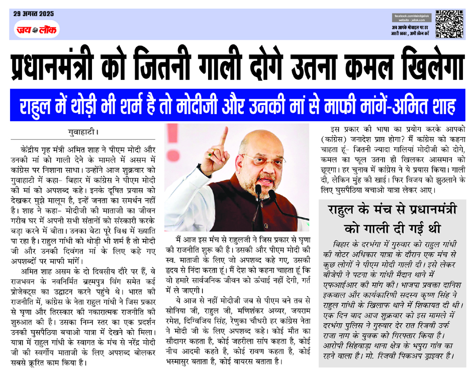 अमित शाह असम के दो दिवसीय दौरे पर हैं, वे राजभवन के नवनिर्मित ब्रह्मपुत्र विंग समेत कई प्रोजेक्ट्स का उद्घाटन करने पहुंचे थे। भारत की राजनीति में, कांग्रेस के नेता राहुल गांधी ने जिस प्रकार से घृणा और तिरस्कार की नकारात्मक राजनीति की शुरुआत की है। उसका निम्न स्तर का एक प्रदर्शन उनकी घुसपैठिया बचाओ यात्रा में देखने को मिला। यात्रा में राहुल गांधी के स्वागत के मंच से नरेंद्र मोदी जी की स्वर्गीय माताजी के लिए अपशब्द बोलकर सबसे क्रूरित काम किया है।
