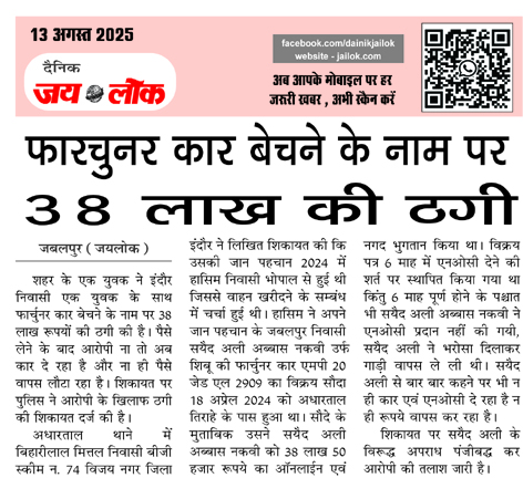हासिम ने अपने जान पहचान के जबलपुर निवासी सयैद अली अब्बास नकवी उर्फ शिबू की फार्चुनर कार एमपी 20 जेड एल 2909 का विक्रय सौदा 18 अप्रेल 2024 को अधारताल तिराहे के पास हुआ था। सौदे के मुताबिक उसने सयैद अली अब्बास नकवी को 38 लाख 50 हजार रूपये का ऑनलाईन एवं नगद भुगतान किया था।