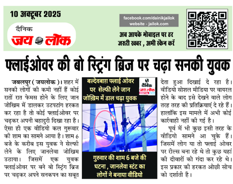 जबलपुर (जयलोक)। शहर में सनकी लोगों की कमी नहीं हैं कोई रातों रात फेमस होने के लिए जान जोखिम में डालकर उटपटांग हरकत कर रहा है तो कोई फ्लाईओवर पर चढक़र अपनी बहादुरी दिखा रहा है। ऐसा ही एक वीडियो कल गुरूवार की शाम का सामने आया है। शाम 6 बजे के करीब इस युवक ने सेल्फी लेने के लिए जानलेवा जोखिम उठाया। जिसमें एक युवक फ्लाईओवर पर बने बो स्ट्रिंग ब्रिज पर चढक़र अपने सनकपन का सबूत देता हुआ दिखाई दे रहा है। वीडियो सोशल मीडिया पर वायरल होने के बाद इसे देखने वाले लोग तरह तरह की प्रतिक्रियाएं दे रहे हैं। हालांकि इस मामले में अभी कोई कार्रवाही नहीं की गई है।