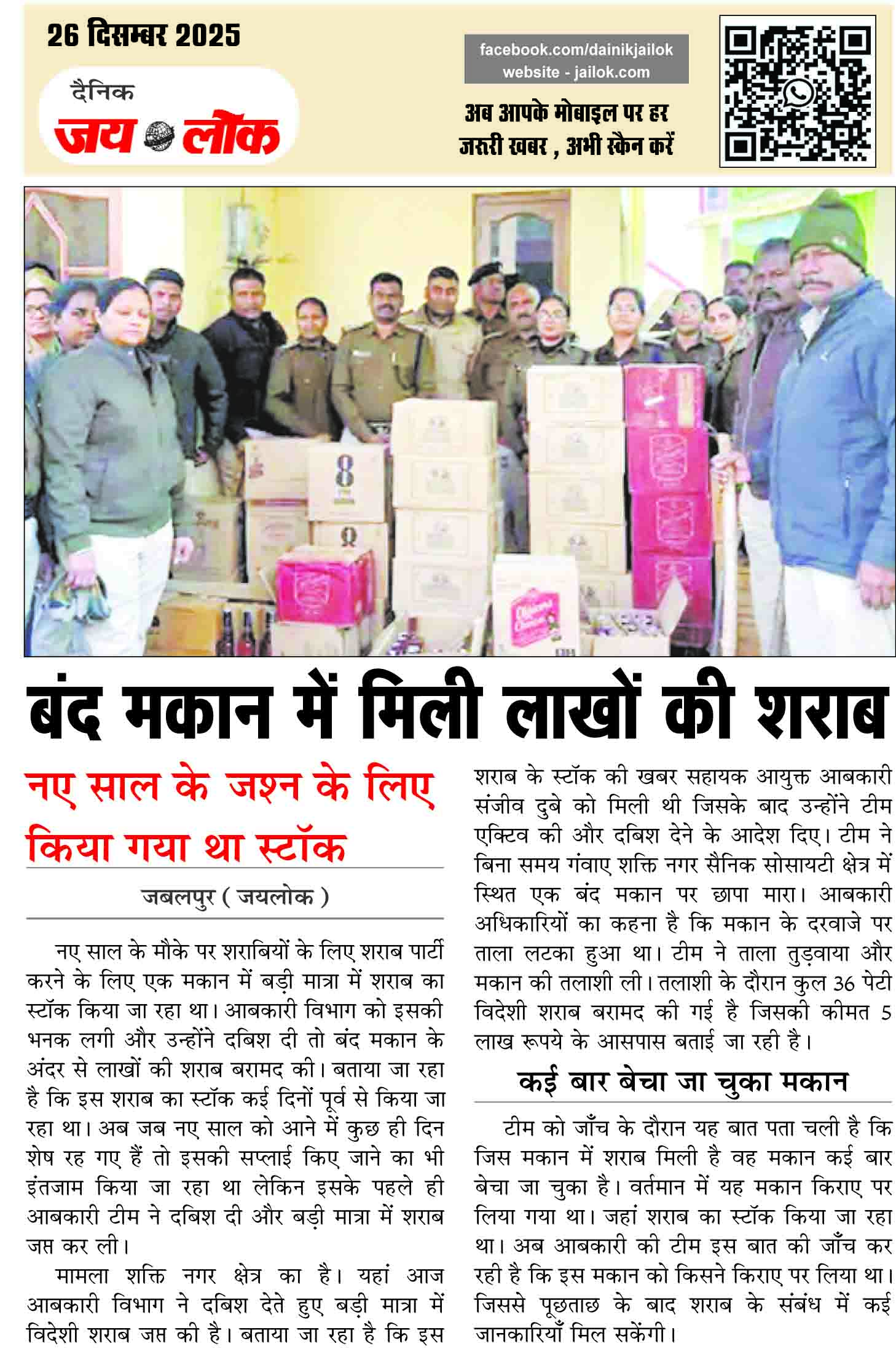 मामला शक्ति नगर क्षेत्र का है। यहां आज आबकारी विभाग ने दबिश देते हुए बड़ी मात्रा में विदेशी शराब जप्त की है। बताया जा रहा है कि इस शराब के स्टॉक की खबर सहायक आयुक्त आबकारी संजीव दुबे को मिली थी जिसके बाद उन्होंने टीम एक्टिव की और दबिश देने के आदेश दिए। टीम ने बिना समय गंवाए शक्ति नगर सैनिक सोसायटी क्षेत्र में स्थित एक बंद मकान पर छापा मारा। आबकारी अधिकारियों का कहना है कि मकान के दरवाजे पर ताला लटका हुआ था। टीम ने ताला तुड़वाया और मकान की तलाशी ली। तलाशी के दौरान कुल 36 पेटी विदेशी शराब बरामद की गई है जिसकी कीमत 5 लाख रूपये के आसपास बताई जा रही है।
