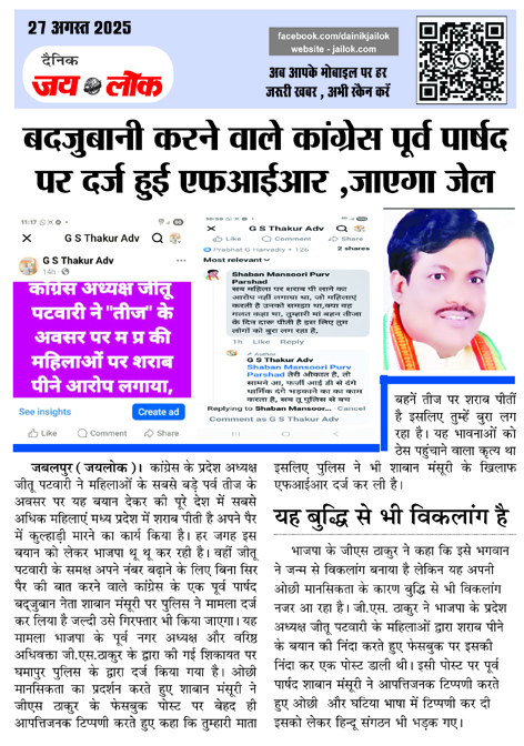 ओछी मानसिकता का प्रदर्शन करते हुए शाबान मंसूरी ने जीएस ठाकुर के फेसबुक पोस्ट पर बेहद ही आपत्तिजनक टिप्पणी करते हुए कहा कि तुम्हारी माता बहनें तीज पर शराब पीतीं है इसलिए तुम्हें बुरा लग रहा है। यह भावनाओं को ठेस पहुंचाने वाला कृत्य था इसलिए पुलिस ने भी शाबान मंसूरी के खिलाफ एफआईआर दर्ज कर ली है।
