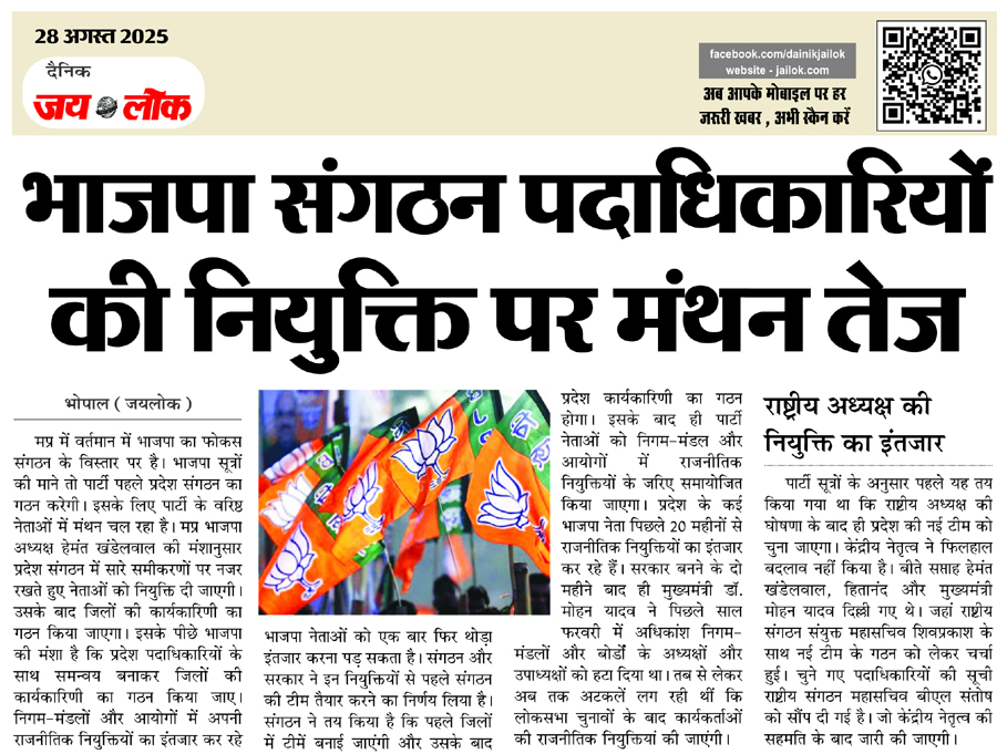 भोपाल (जयलोक)। मप्र में वर्तमान में भाजपा का फोकस संगठन के विस्तार पर है। भाजपा सूत्रों की माने तो पार्टी पहले प्रदेश संगठन का गठन करेगी। इसके लिए पार्टी के वरिष्ठ नेताओं में मंथन चल रहा है। मप्र भाजपा अध्यक्ष हेमंत खंडेलवाल की मंशानुसार प्रदेश संगठन में सारे समीकरणों पर नजर रखते हुए नेताओं को नियुक्ति दी जाएगी। उसके बाद जिलों की कार्यकारिणी का गठन किया जाएगा। इसके पीछे भाजपा की मंशा है कि प्रदेश पदाधिकारियों के साथ समन्वय बनाकर जिलों की कार्यकारिणी का गठन किया जाए। निगम-मंडलों और आयोगों में अपनी राजनीतिक नियुक्तियों का इंतजार कर रहे भाजपा नेताओं को एक बार फिर थोड़ा इंतजार करना पड़ सकता है। संगठन और सरकार ने इन नियुक्तियों से पहले संगठन की टीम तैयार करने का निर्णय लिया है। संगठन ने तय किया है कि पहले जिलों में टीमें बनाई जाएंगी और उसके बाद प्रदेश कार्यकारिणी का गठन होगा। इसके बाद ही पार्टी नेताओं को निगम-मंडल और आयोगों में राजनीतिक नियुक्तियों के जरिए समायोजित किया जाएगा। प्रदेश के कई भाजपा नेता पिछले 20 महीनों से राजनीतिक नियुक्तियों का इंतजार कर रहे हैं। सरकार बनने के दो महीने बाद ही मुख्यमंत्री डॉ. मोहन यादव ने पिछले साल फरवरी में अधिकांश निगम-मंडलों और बोर्डों के अध्यक्षों और उपाध्यक्षों को हटा दिया था। तब से लेकर अब तक अटकलें लग रही थीं कि लोकसभा चुनावों के बाद कार्यकर्ताओं की राजनीतिक नियुक्तियां की जाएंगी।