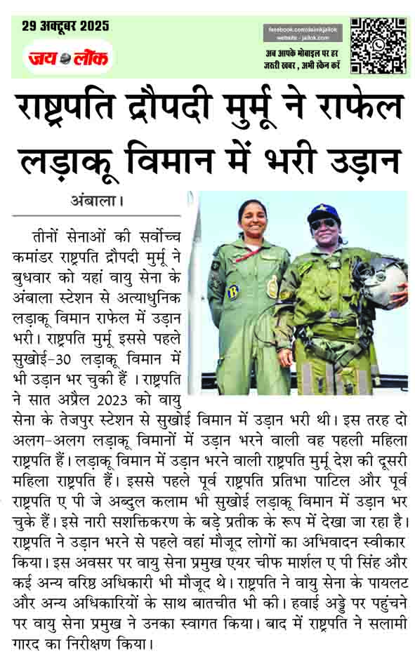 अंबाला। तीनों सेनाओं की सर्वोच्च कमांडर राष्ट्रपति द्रौपदी मुर्मू ने बुधवार को यहां वायु सेना के अंबाला स्टेशन से अत्याधुनिक लड़ाकू विमान राफेल में उड़ान भरी। राष्ट्रपति मुर्मू इससे पहले सुखोई-30 लड़ाकू विमान में भी उड़ान भर चुकी हैं ।