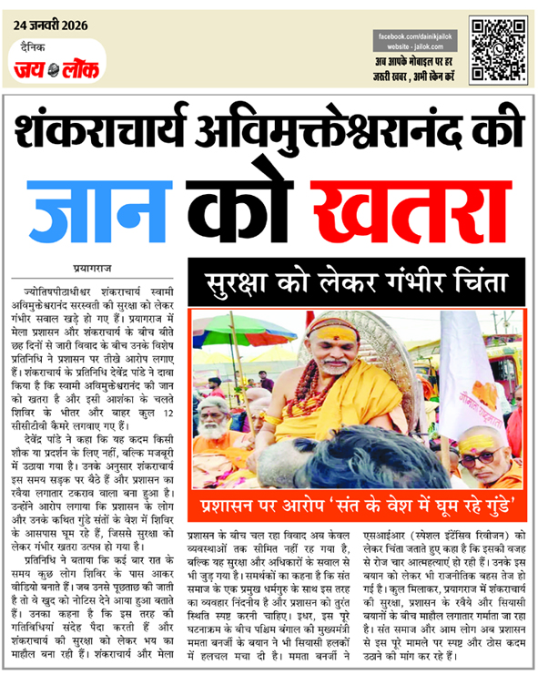 प्रतिनिधि ने बताया कि कई बार रात के समय कुछ लोग शिविर के पास आकर वीडियो बनाते हैं। जब उनसे पूछताछ की जाती है तो वे खुद को नोटिस देने आया हुआ बताते हैं। उनका कहना है कि इस तरह की गतिविधियां संदेह पैदा करती हैं और शंकराचार्य की सुरक्षा को लेकर भय का माहौल बना रही हैं। शंकराचार्य और मेला प्रशासन के बीच चल रहा विवाद अब केवल व्यवस्थाओं तक सीमित नहीं रह गया है, बल्कि यह सुरक्षा और अधिकारों के सवाल से भी जुड़ गया है। समर्थकों का कहना है कि संत समाज के एक प्रमुख धर्मगुरु के साथ इस तरह का व्यवहार निंदनीय है और प्रशासन को तुरंत स्थिति स्पष्ट करनी चाहिए। इधर, इस पूरे घटनाक्रम के बीच पश्चिम बंगाल की मुख्यमंत्री ममता बनर्जी के बयान ने भी सियासी हलकों में हलचल मचा दी है। ममता बनर्जी ने एसआईआर (स्पेशल इंटेंसिव रिवीजन) को लेकर चिंता जताते हुए कहा है कि इसकी वजह से रोज चार आत्महत्याएं हो रही हैं। उनके इस बयान को लेकर भी राजनीतिक बहस तेज हो गई है। कुल मिलाकर, प्रयागराज में शंकराचार्य की सुरक्षा, प्रशासन के रवैये और सियासी बयानों के बीच माहौल लगातार गर्माता जा रहा है। संत समाज और आम लोग अब प्रशासन से इस पूरे मामले पर स्पष्ट और ठोस कदम उठाने की मांग कर रहे हैं।