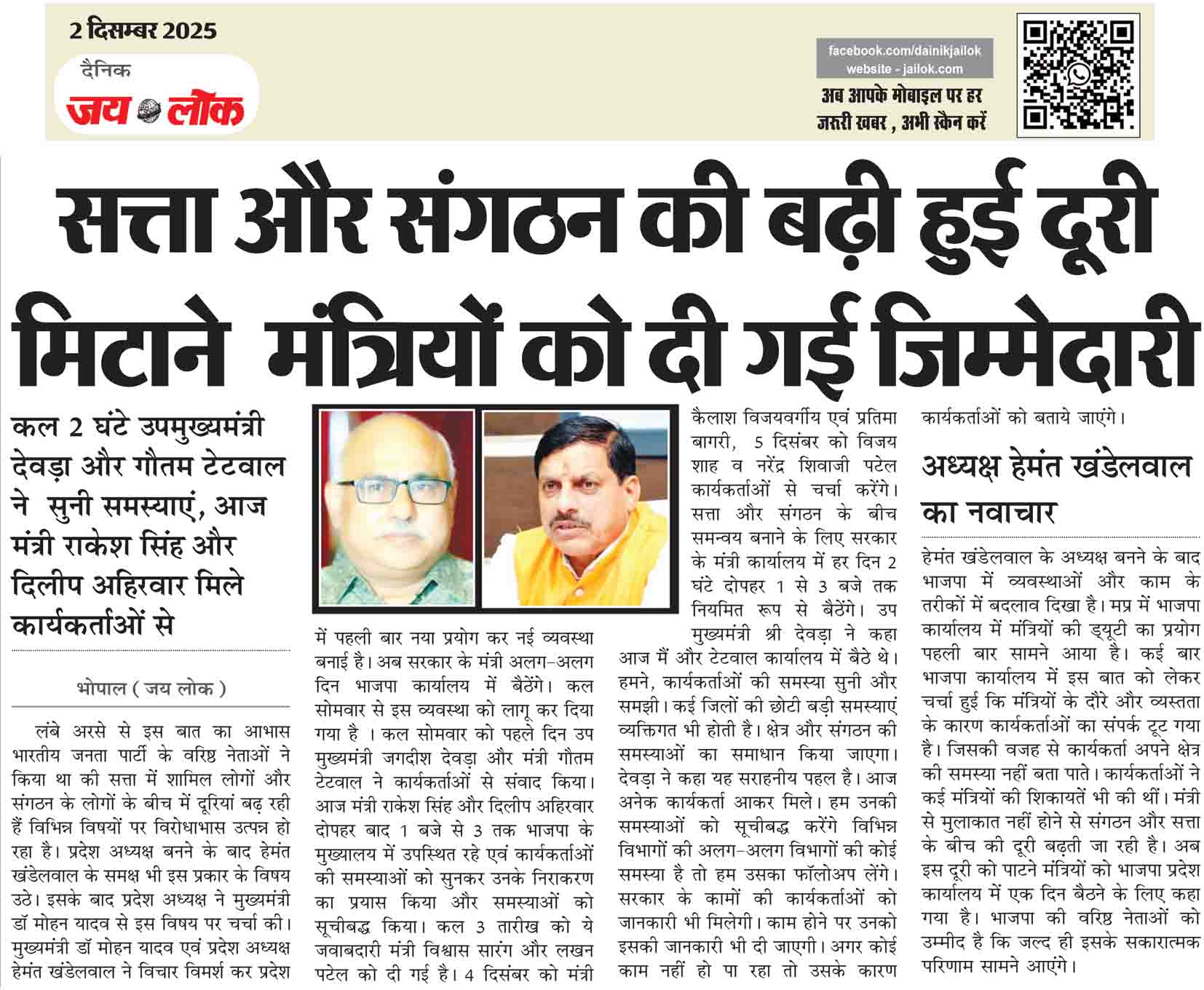 कल 2 घंटे उपमुख्यमंत्री देवड़ा और गौतम टेटवाल ने सुनी समस्याएं, आज मंत्री राकेश सिंह और दिलीप अहिरवार मिले कार्यकर्ताओं से