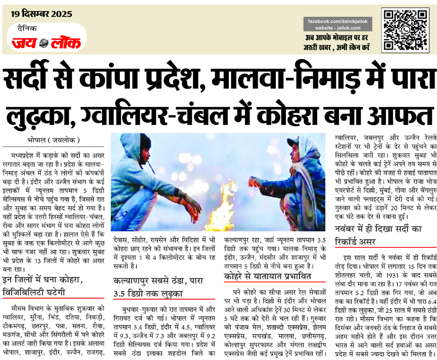इस साल सर्दी ने नवंबर में ही रिकॉर्ड तोड़ दिया। भोपाल में लगातार 15 दिन तक शीतलहर चली, जो 1931 के बाद सबसे लंबा दौर माना जा रहा है। 17 नवंबर की रात तापमान 5.2 डिग्री तक गिर गया, जो अब तक का रिकॉर्ड है। वहीं इंदौर में भी पारा 6.4 डिग्री तक लुढक़ा, जो 25 साल में सबसे ठंडी रात रही। मौसम विभाग का कहना है कि दिसंबर और जनवरी ठंड के लिहाज से सबसे अहम महीने होते हैं और इस दौरान उत्तर भारत से आने वाली सर्द हवाओं का असर प्रदेश में सबसे ज्यादा देखने को मिलता है।
