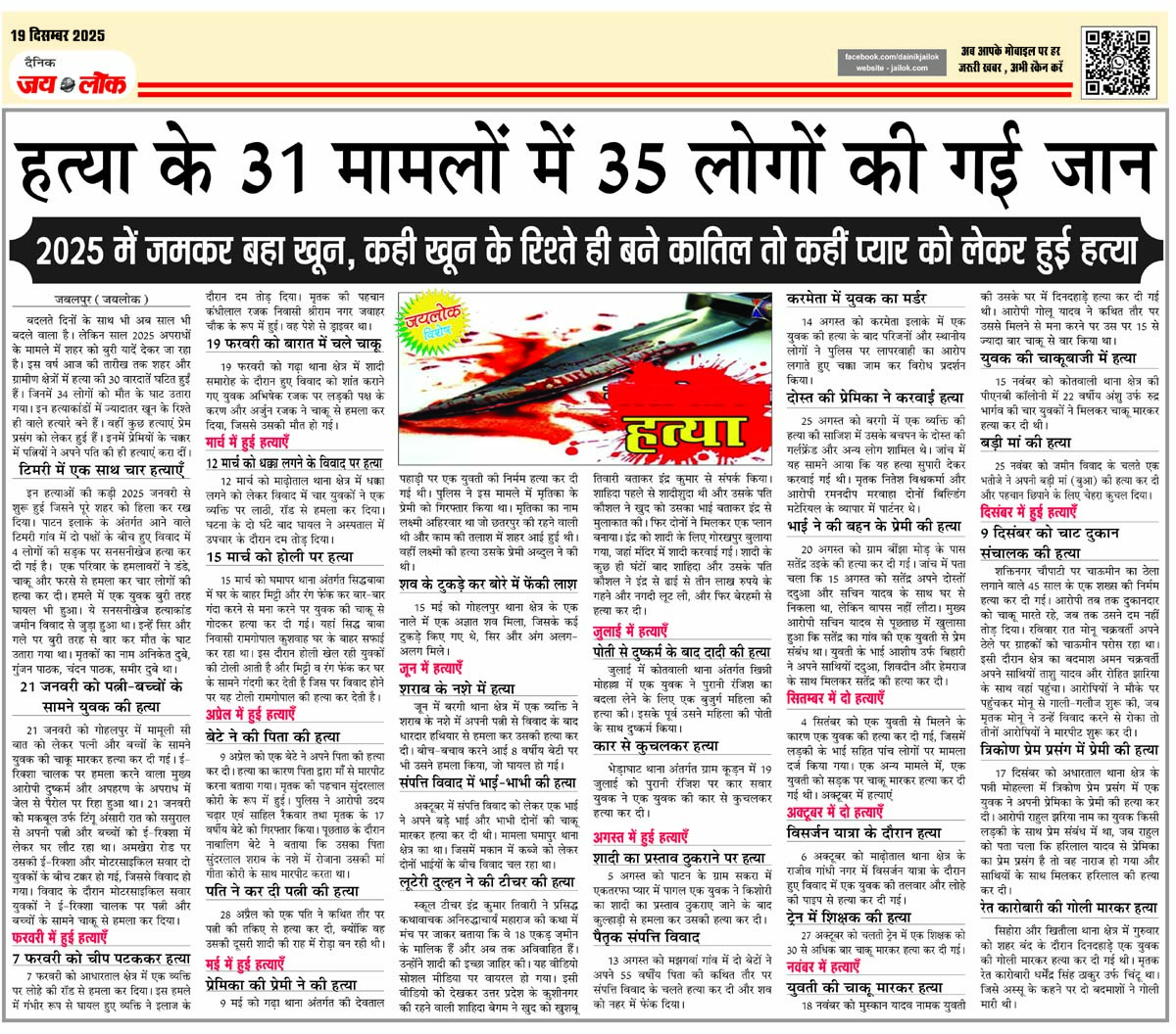 जबलपुर (जयलोक)। बदलते दिनों के साथ भी अब साल भी बदले वाला है। लेकिन साल 2025 अपराधों के मामले में शहर को बुरी यादें देकर जा रहा है। इस वर्ष आज की तारीख तक शहर और ग्रामीण क्षेत्रों में हत्या की 30 वारदातें घटित हुईं हैं। जिनमें 34 लोगों को मौत के घाट उतारा गया। इन हत्याकांडों में ज्यादातर खून के रिश्ते ही वाले हत्यारे बने हैं। वहीं कुछ हत्याएं प्रेम प्रसंग को लेकर हुई हैं। इनमें प्रेमियों के चक्कर में पत्नियों ने अपने पति की ही हत्याएं करा दीं।