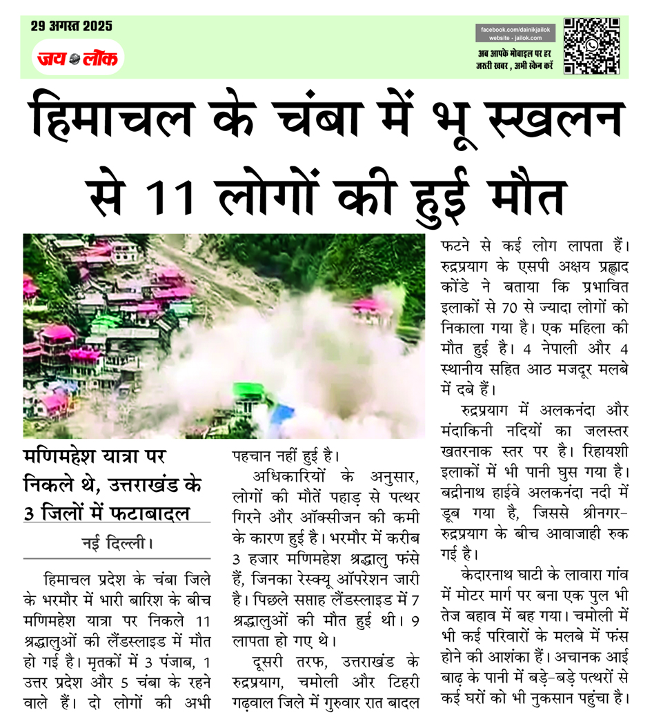 नई दिल्ली। हिमाचल प्रदेश के चंबा जिले के भरमौर में भारी बारिश के बीच मणिमहेश यात्रा पर निकले 11 श्रद्धालुओं की लैंडस्लाइड में मौत हो गई है। मृतकों में 3 पंजाब, 1 उत्तर प्रदेश और 5 चंबा के रहने वाले हैं। दो लोगों की अभी पहचान नहीं हुई है।