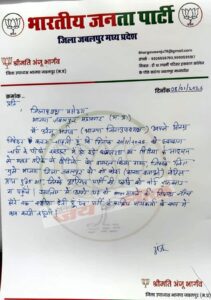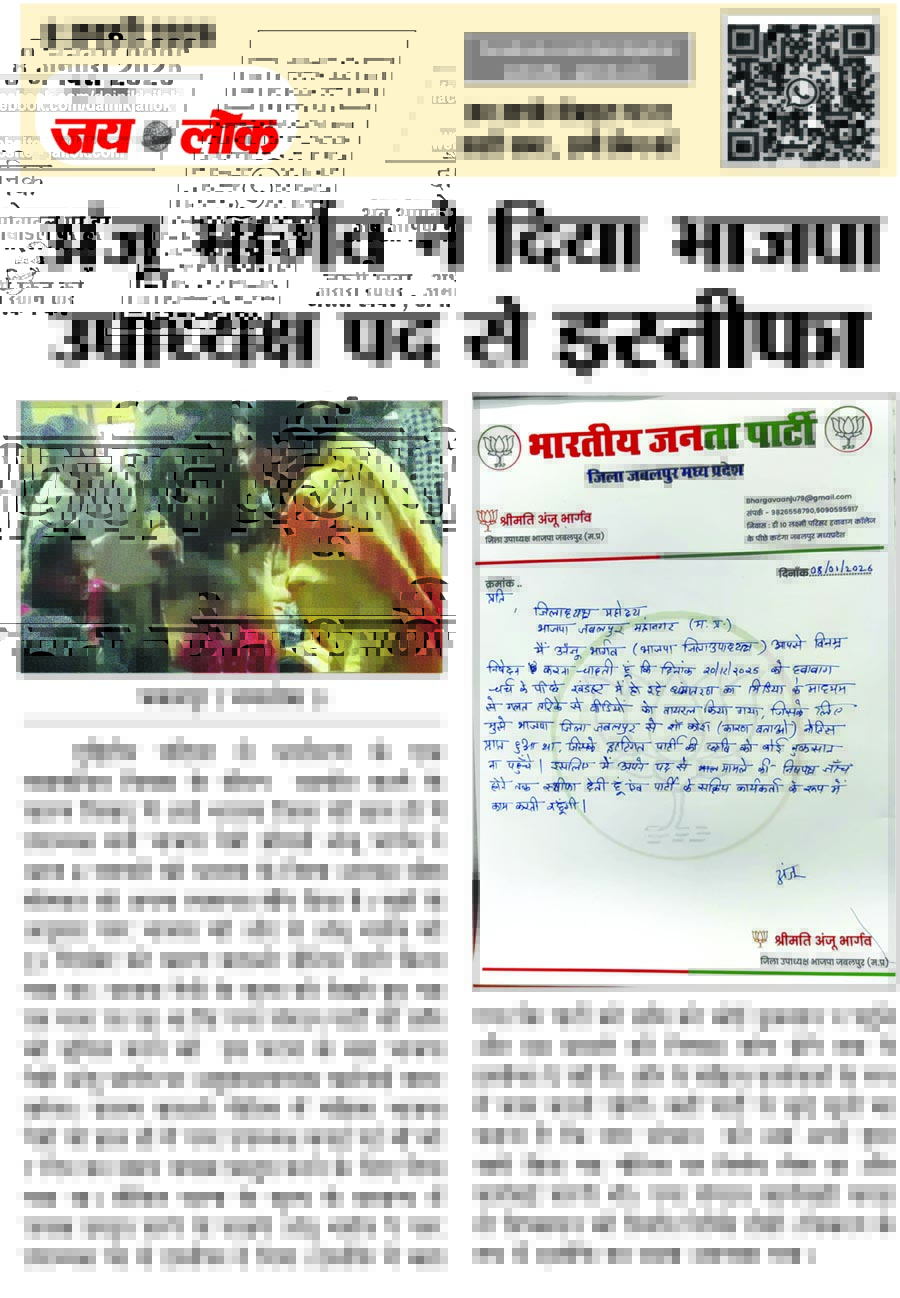 जबलपुर (जयलोक)। दृष्टिहीन महिला से धर्मांतरण के एक तथाकथित विवाद के दौरान मारपीट करने के कारण विवाद में आई भाजपा जिला की हाल ही में उपाध्यक्ष बनी भाजपा नेत्री श्रीमती अंजू भार्गव ने आज 8 जनवरी को भाजपा के जिला अध्यक्ष रत्नेश सोनकर को अपना त्यागपत्र सौंप दिया है। सूत्रों के अनुसार नगर भाजपा की ओर से अंजू भार्गव को 23 दिसंबर को कारण बताओ नोटिस जारी किया गया था।