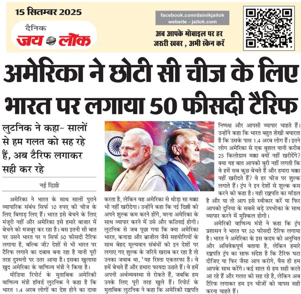 लुटनिक ने कहा- सालों से हम गलत को सह रहे हैं, अब टैरिफ लगाकर सही कर रहे नई दिल्ली। अमेरिका ने भारत के साथ सालों पुराने व्यापारिक संबंध सिर्फ 10 रुपए की चीज के लिए बिगाड़ लिए हैं। भारत इसे बेचने के लिए मंजूरी नहीं और अमेरिका इसे हमारे बाजार में बेचने को मजबूर कर … Continue reading अमेरिका ने छोटी सी चीज के लिए भारत पर लगाया 50 फीसदी टैरिफ