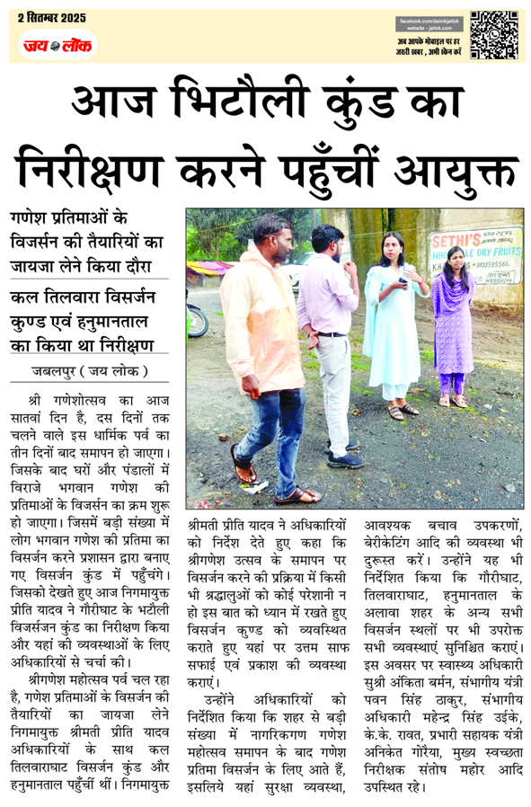 श्रीगणेश महोत्सव पर्व चल रहा है, गणेश प्रतिमाओं के विसर्जन की तैयारियों का जायजा लेने निगमायुक्त श्रीमती प्रीति यादव अधिकारियों के साथ कल तिलवाराघाट विसर्जन कुंड और हनुमानताल पहुँचीं थीं। निगमायुक्त श्रीमती प्रीति यादव ने अधिकारियों को निर्देश देते हुए कहा कि श्रीगणेश उत्सव के समापन पर विसर्जन करने की प्रक्रिया में किसी भी श्रद्धालुओं को कोई परेशानी न हो इस बात को ध्यान में रखते हुए विसर्जन कुण्ड को व्यवस्थित कराते हुए यहां पर उत्तम साफ  सफाई एवं प्रकाश की व्यवस्था कराएं।