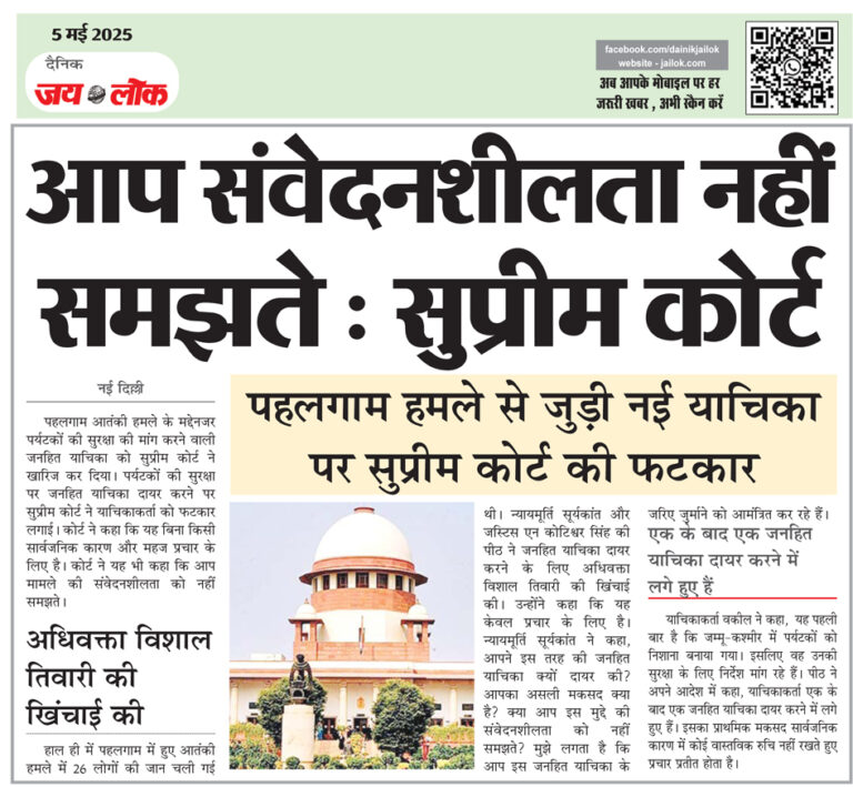 पहलगाम हमले से जुड़ी नई याचिका पर सुप्रीम कोर्ट की फटकार नई दिल्ली। पहलगाम आतंकी हमले के मद्देनजर पर्यटकों की सुरक्षा की मांग करने वाली जनहित याचिका को सुप्रीम कोर्ट ने खारिज कर दिया। पर्यटकों की सुरक्षा पर जनहित याचिका दायर करने पर सुप्रीम कोर्ट ने याचिकाकर्ता को फटकार लगाई। कोर्ट ने कहा कि यह … Continue reading आप संवेदनशीलता नहीं समझते : सुप्रीम कोर्ट