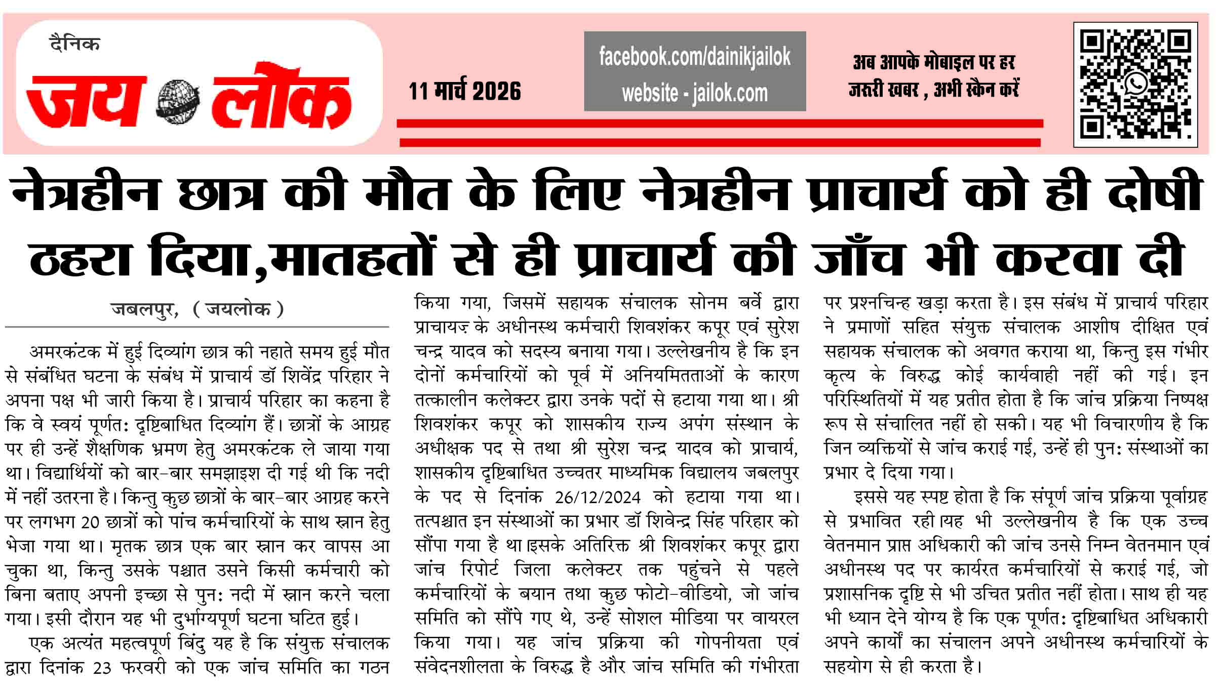 जबलपुर,  (जयलोक)। अमरकंटक में हुई दिव्यांग छात्र की नहाते समय हुई मौत से संबंधित घटना के संबंध में प्राचार्य डॉ