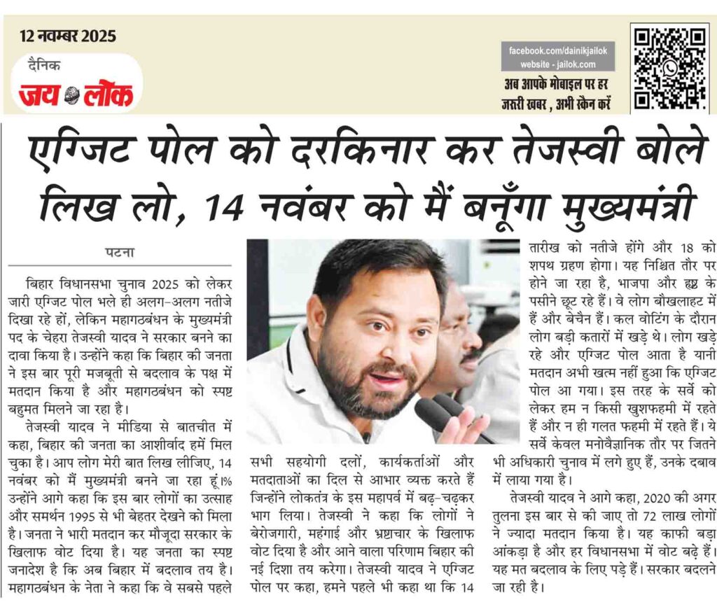 एग्जिट पोल को दरकिनार कर तेजस्वी बोले लिख लो, 14 नवंबर को मैं बनूँगा मुख्यमंत्री