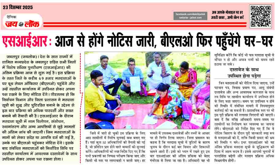 जबलपुर (जयलोक)। देश के सात राज्यों में शामिल मध्यप्रदेश के जबलपुर सहित सभी जिलों में विशेष संक्षिप्त पुनरीक्षण (एसआईआर) की अंतिम प्रक्रिया आज से शुरू गई है। इस प्रक्रिया के तहत जिले के करीब 69 हजार मतदाताओं के घर बूथ लेवल ऑफिसर (बीएलओ) पहुंचेंगे और उन्हें तहसील कार्यालय में उपस्थित होकर अपना पक्ष रखने के लिए नोटिस देंगे। गौरतलब हो कि निर्वाचन विभाग और जिला प्रशासन ने मतदाता सूची को शुद्ध और त्रुटिरहित बनाने के उद्देश्य से इस बार प्रक्रिया को अधिक पारदर्शी और सख्त बनाने की तैयारी की है। एसआईआर के दौरान मतदाता सूची में नाम विलोपन, संशोधन, स्थानांतरण और अन्य आपत्तियों से जुड़े मामलों की अंतिम जांच की जाएगी। जिन मतदाताओं के नामों को लेकर संदेह या आपत्ति दर्ज की गई है, उनके घर बीएलओ पहुंचकर नोटिस देंगे। इसके बाद संबंधित मतदाताओं को निर्धारित तिथि पर तहसील कार्यालय में आवश्यक दस्तावेजों के साथ उपस्थित होकर अपना पक्ष रखना होगा।