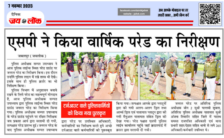 जबलपुर (जयलोक)। पुलिस अधीक्षक सम्पत उपाध्याय ने आज पुलिस लाईन्स स्थित परेड ग्राउंड पर जनरल परेड का निरीक्षण किया। इस दौरान उन्होंने पुलिस लाइन में रखे शस्त्र भी देखे। इसके साथ ही पुलिस क्वार्टर का भी निरीक्षण किया। पुलिस विभाग में अनुशासन बनाये रखने के लिये परेड का महत्वपूर्ण योगदान है, आज पुलिस अधीक्षक सम्पत … Continue reading एसपी ने किया वार्षिक परेड का निरीक्षण, टर्नआउट वाले पुलिसकर्मियों को किया गया पुरस्कृत