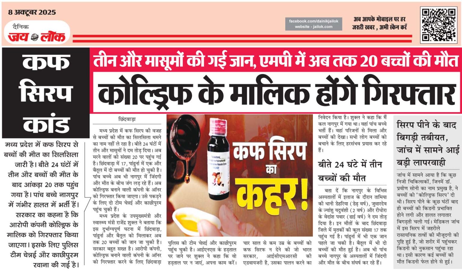 छिंदवाड़ा । मध्य प्रदेश में कफ सिरप से बच्चों की मौत का सिलसिला जारी है। बीते 24 घंटों में तीन और बच्चों की मौत के बाद आंकड़ा 20 तक पहुंच गया है। पांच बच्चे नागपुर में गंभीर हालत में भर्ती हैं। सरकार का कहना है कि आरोपी कंपनी कोल्ड्रिफ के मालिक को गिरफ्तार किया जाएगा। … Continue reading कफ सिरप कांड तीन और मासूमों की गई जान, एमपी में अब तक 20 बच्चों की मौत, कोल्ड्रिफ के मालिक होंगे गिरफ्तार