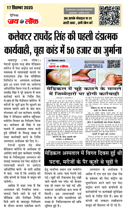 जबलपुर (जय लोक)। नेताजी सुभाष चन्द्र बोस मेडिकल कॉलेज में पेस्ट कंट्रोल एवं सफाई व्यवस्था में लापरवाही बरतने पर एचएलएल इंफ्रा टेक सर्विसिस लिमिटेड पर अस्पताल अधीक्षक द्वारा 50 हजार रुपये का अर्थदण्ड अधिरोपित किया गया है। कलेक्टर राघवेंद्र सिंह ने पूरे प्रकरण में सत्य कार्रवाई करने के निर्देश दिए थे। ज्ञात हो कि मेडीकल … Continue reading कलेक्टर राघवेंद्र सिंह की पहली दंडात्मक कार्यवाही, चूहा कांड में 50 हजार का जुर्माना, मेडिकल अस्पताल में विगत दिवस हुई थी घटना, मरीजों के पैर कुतरे थे चूहों ने