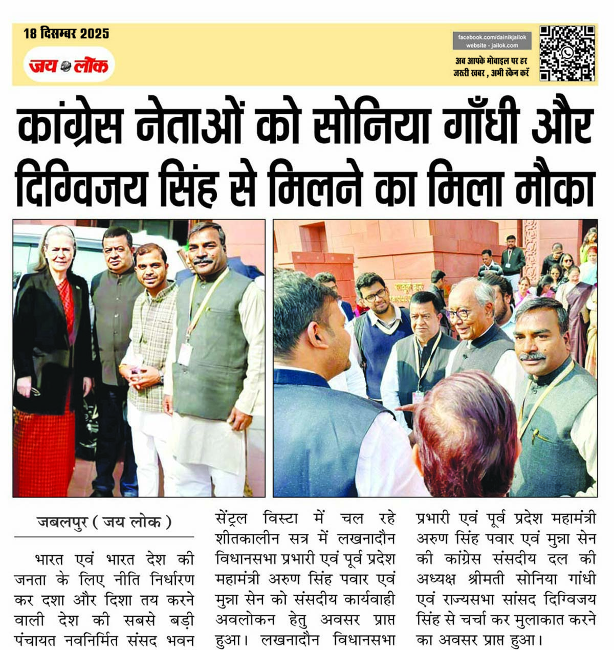 जबलपुर (जय लोक)। भारत एवं भारत देश की जनता के लिए नीति निर्धारण कर दशा और दिशा तय करने वाली देश की सबसे बड़ी पंचायत नवनिर्मित संसद भवन सेंट्रल विस्टा में चल रहे शीतकालीन सत्र में लखनादौन विधानसभा प्रभारी एवं पूर्व प्रदेश महामंत्री अरुण सिंह पवार एवं मुन्ना सेन को संसदीय कार्यवाही अवलोकन हेतु अवसर … Continue reading कांग्रेस नेताओं को सोनिया गाँधी और दिग्विजय सिंह से मिलने का मिला मौका