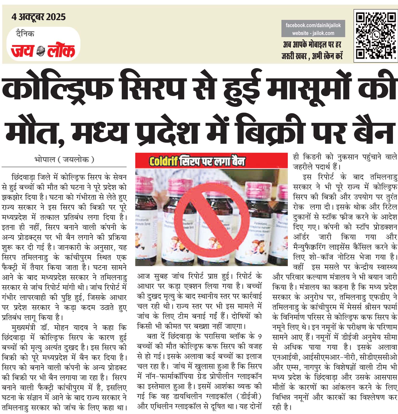भोपाल (जयलोक)। छिंदवाड़ा जिले में कोल्ड्रिफ सिरप के सेवन से हुई बच्चों की मौत की घटना ने पूरे प्रदेश को झकझोर दिया है। घटना को गंभीरता से लेते हुए राज्य सरकार ने इस सिरप की बिक्री पर पूरे मध्यप्रदेश में तत्काल प्रतिबंध लगा दिया है। इतना ही नहीं, सिरप बनाने वाली कंपनी के अन्य प्रोडक्ट्स … Continue reading कोल्ड्रिफ सिरप से हुई मासूमों की मौत, मध्य प्रदेश में बिक्री पर बैन