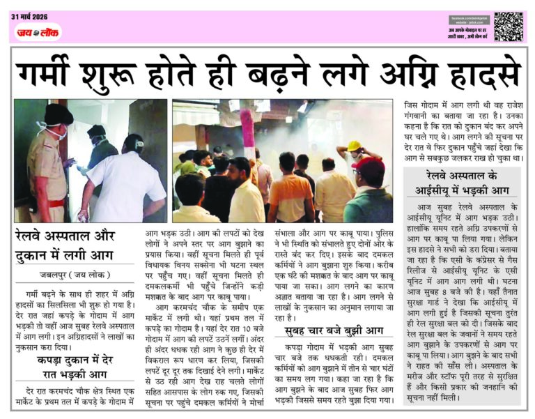 जबलपुर (जय लोक)।गर्मी बढऩे के साथ ही शहर में अग्रि हादसों का सिलसिला भी शुरू हो गया है। देर रात जहां कपड़े के गोदाम में आग भडक़ी तो वहीं आज सुबह रेलवे अस्पताल में आग लगी। इन अग्रिहादसों ने लाखों का नुकसान करा दिया। कपड़ा दुकान में देर रात भडक़ी आग देर रात करमचंद चौक … Continue reading गर्मी शुरू होते ही बढऩे लगे अग्रि हादसे, रेलवे अस्पताल और दुकान में लगी आग