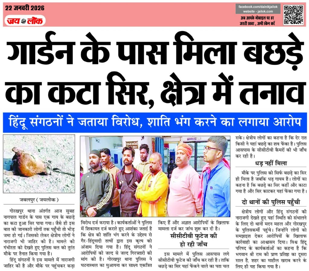 हिंदू संगठनों ने जताया विरोध, शाति भंग करने का लगाया आरोप जबलपुर (जयलोक)। गोरखपुर थाना अंतर्गत आज सुबह नागपाल गार्डन के पास एक गाय के बछड़े का कटा हुआ सिर पाया गया। जैसे ही इस बात की जानकारी लोगों तक पहुँची तो भीड़ जमा हो गई। जिसको लेकर क्षेत्रीय लोगों ने नाराजगी भी जाहिर की … Continue reading गार्डन के पास मिला बछड़े का कटा सिर, क्षेत्र में तनाव