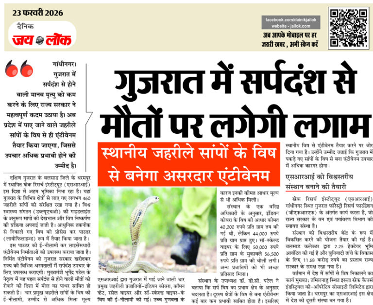 स्थानीय जहरीले सांपों के विष से बनेगा असरदार एंटीवेनम गांधीनगर। गुजरात में सर्पदंश से होने वाली मानव मृत्यु को कम करने के लिए राज्य सरकार ने महत्वपूर्ण कदम उठाया है। अब प्रदेश में पाए जाने वाले जहरीले सांपों के विष से ही एंटीवेनम तैयार किया जाएगा, जिससे उपचार अधिक प्रभावी होने की उम्मीद है। दक्षिण … Continue reading गुजरात में सर्पदंश से मौतों पर लगेगी लगाम